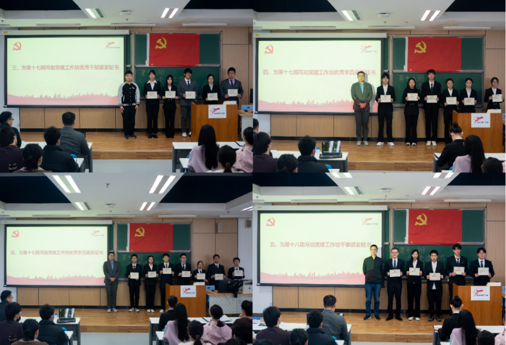 开班仪式在激昂的《国际歌》声中正式开始。与会领导和老师先后为第十七期冯如党建工作坊优秀干部、优秀学员代表颁发荣誉证书,并为第十八期党建工作坊干事代表颁发聘书。